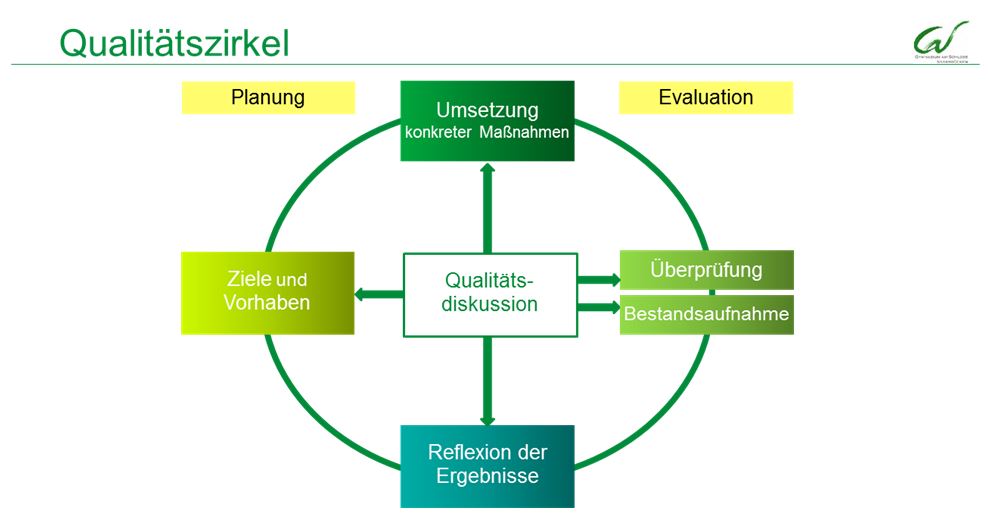 Was hat die QVP-Staffel noch gebracht? Auf die Anerkennung, dass sich Schulqualität vor allem dann besonders positiv entwickelt, wenn die Teilnahme vieler gegeben ist, wurde bereits hingewiesen. Darüber hinaus hat sich das „Handwerkszeug“ für die Schulentwicklung systematisiert: es hat sich eine ausgeprägte Sitzungskultur etabliert; die Dokumentation der Ergebnisse, wie sie im Rahmen der Arbeitsgemeinschaften erbracht werden, wird konsequent und einheitlich betrieben. Schließlich werden durchgeführte Maßnahmen gemäß des Qualitätszirkels nach Abschluss evaluiert und gegebenenfalls verbessert.